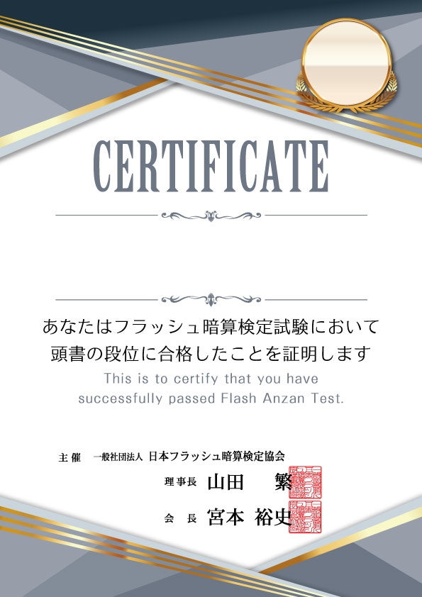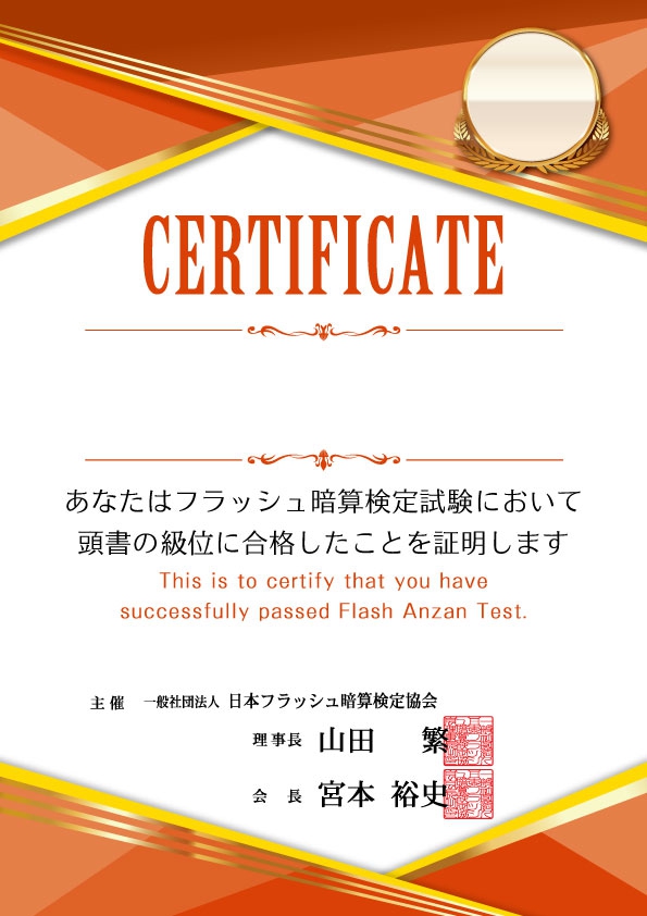 筆耕は全て一般社団法人日本フラッシュ暗算検定協会にて行います。 フォント等は当協会に一任ください。(教科書体フォントを使用) 生年月日は西暦で、施行日は受験した月の月末を西暦で記載しています。